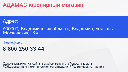 АДАМАС, ювелирный магазин по адресу 600000, Владимирская область, Владимир, Большая Московская, 19а в дальнейшем Организация, размещена в следующих категориях: