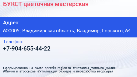БУКЕТ, цветочная мастерская по адресу 600005, Владимирская область, Владимир, Горького, 64 в дальнейшем Организация, размещена в следующих категориях: