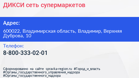 ДИКСИ, сеть супермаркетов по адресу 600022, Владимирская область, Владимир, Верхняя Дуброва, 10 в дальнейшем Организация, размещена в следующих категориях: