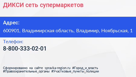 ДИКСИ, сеть супермаркетов по адресу 600901, Владимирская область, Владимир, Ноябрьская, 1 в дальнейшем Организация, размещена в следующих категориях: