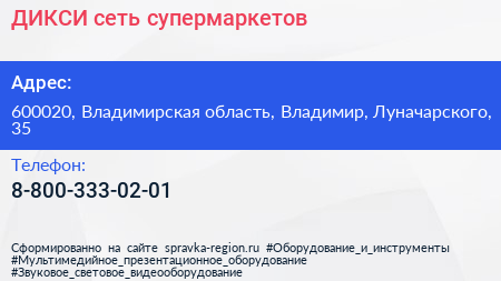 ДИКСИ, сеть супермаркетов по адресу 600020, Владимирская область, Владимир, Луначарского, 35 в дальнейшем Организация, размещена в следующих категориях: