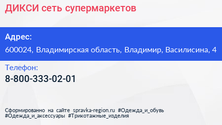 ДИКСИ, сеть супермаркетов по адресу 600024, Владимирская область, Владимир, Василисина, 4 в дальнейшем Организация, размещена в следующих категориях: