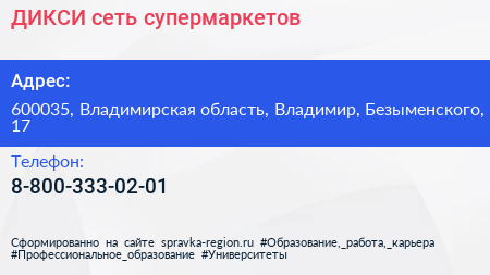 ДИКСИ, сеть супермаркетов по адресу 600035, Владимирская область, Владимир, Безыменского, 17 в дальнейшем Организация, размещена в следующих категориях: