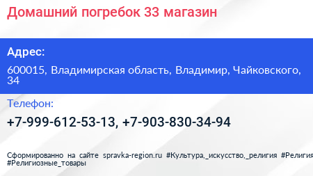 Домашний погребок 33, магазин по адресу 600015, Владимирская область, Владимир, Чайковского, 34 в дальнейшем Организация, размещена в следующих категориях: