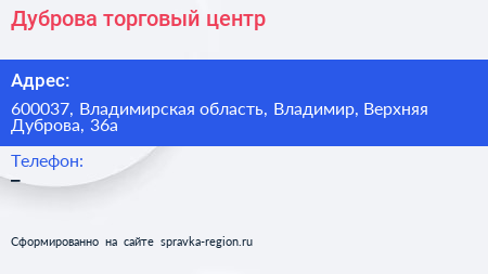 Дуброва, торговый центр по адресу 600037, Владимирская область, Владимир, Верхняя Дуброва, 36а в дальнейшем Организация, размещена в следующих категориях: