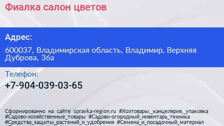 Фиалка, салон цветов по адресу 600037, Владимирская область, Владимир, Верхняя Дуброва, 36а в дальнейшем Организация, размещена в следующих категориях:
