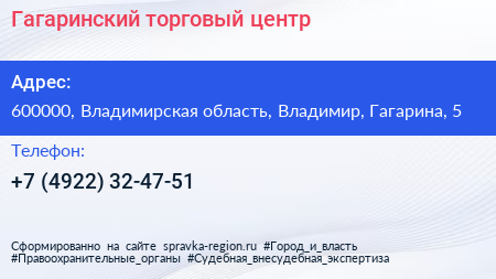 Гагаринский, торговый центр по адресу 600000, Владимирская область, Владимир, Гагарина, 5 в дальнейшем Организация, размещена в следующих категориях: