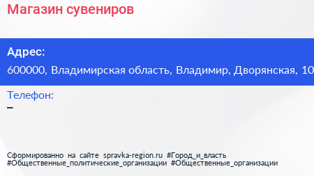 Магазин сувениров по адресу 600000, Владимирская область, Владимир, Дворянская, 10 в дальнейшем Организация, размещена в следующих категориях: