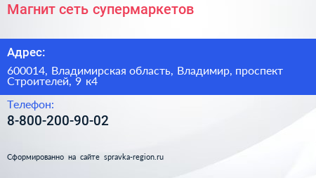 Магнит, сеть супермаркетов по адресу 600014, Владимирская область, Владимир, проспект Строителей, 9 к4 в дальнейшем Организация, размещена в следующих категориях: