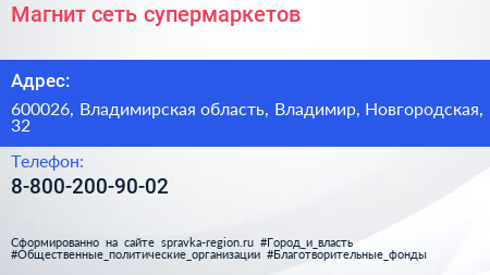 Магнит, сеть супермаркетов по адресу 600026, Владимирская область, Владимир, Новгородская, 32 в дальнейшем Организация, размещена в следующих категориях: