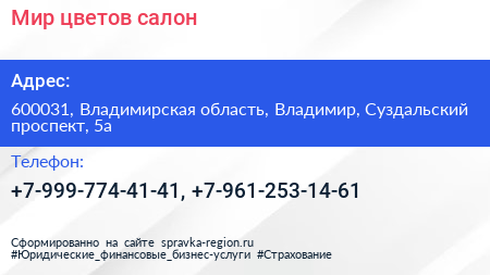 Мир цветов, салон по адресу 600031, Владимирская область, Владимир, Суздальский проспект, 5а в дальнейшем Организация, размещена в следующих категориях: