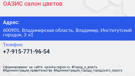 ОАЗИС, салон цветов по адресу 600901, Владимирская область, Владимир, Институтский городок, 3 к1 в дальнейшем Организация, размещена в следующих категориях: