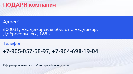 ПОДАРИ, компания по адресу 600031, Владимирская область, Владимир, Добросельская, 169Б в дальнейшем Организация, размещена в следующих категориях:
