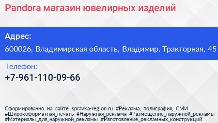 Pandora, магазин ювелирных изделий по адресу 600026, Владимирская область, Владимир, Тракторная, 45 в дальнейшем Организация, размещена в следующих категориях:
