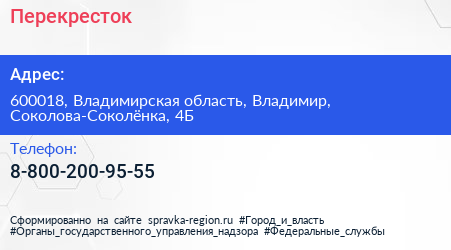 Перекресток по адресу 600018, Владимирская область, Владимир, Соколова-Соколёнка, 4Б в дальнейшем Организация, размещена в следующих категориях: