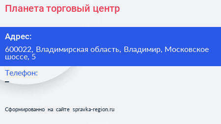 Планета, торговый центр по адресу 600022, Владимирская область, Владимир, Московское шоссе, 5 в дальнейшем Организация, размещена в следующих категориях: