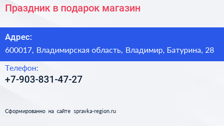 Праздник в подарок, магазин по адресу 600017, Владимирская область, Владимир, Батурина, 28 в дальнейшем Организация, размещена в следующих категориях: