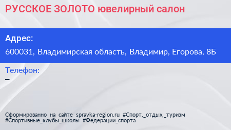 РУССКОЕ ЗОЛОТО, ювелирный салон по адресу 600031, Владимирская область, Владимир, Егорова, 8Б в дальнейшем Организация, размещена в следующих категориях: