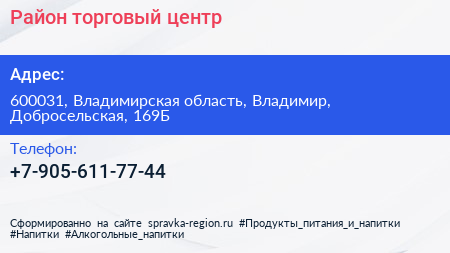 Район, торговый центр по адресу 600031, Владимирская область, Владимир, Добросельская, 169Б в дальнейшем Организация, размещена в следующих категориях: