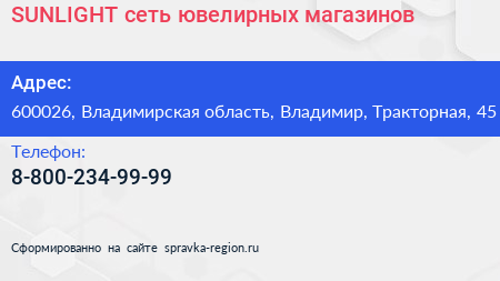 SUNLIGHT, сеть ювелирных магазинов по адресу 600026, Владимирская область, Владимир, Тракторная, 45 в дальнейшем Организация, размещена в следующих категориях: