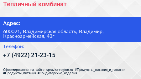 Тепличный, комбинат по адресу 600021, Владимирская область, Владимир, Красноармейская, 43г в дальнейшем Организация, размещена в следующих категориях: