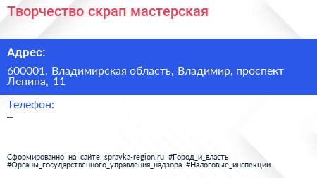 Творчество, скрап-мастерская по адресу 600001, Владимирская область, Владимир, проспект Ленина, 11 в дальнейшем Организация, размещена в следующих категориях: