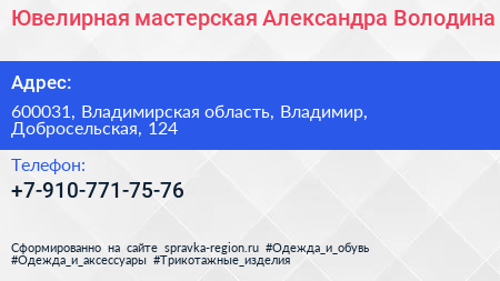 Ювелирная мастерская Александра Володина по адресу 600031, Владимирская область, Владимир, Добросельская, 124 в дальнейшем Организация, размещена в следующих категориях: