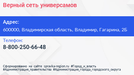 Верный, сеть универсамов по адресу 600000, Владимирская область, Владимир, Гагарина, 2Б в дальнейшем Организация, размещена в следующих категориях: