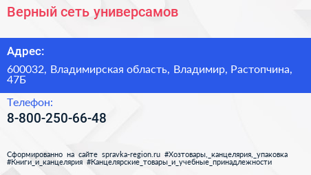 Верный, сеть универсамов по адресу 600032, Владимирская область, Владимир, Растопчина, 47Б в дальнейшем Организация, размещена в следующих категориях: