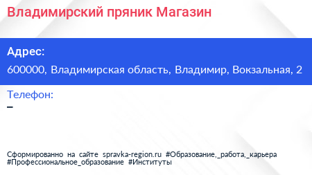 Владимирский пряник, Магазин по адресу 600000, Владимирская область, Владимир, Вокзальная, 2 в дальнейшем Организация, размещена в следующих категориях: