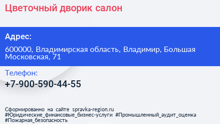Цветочный дворик, салон по адресу 600000, Владимирская область, Владимир, Большая Московская, 71 в дальнейшем Организация, размещена в следующих категориях: