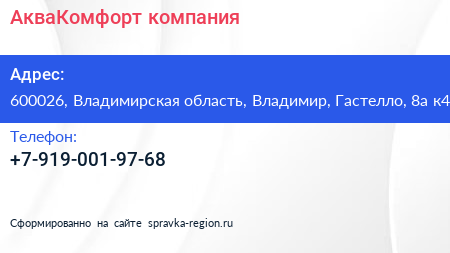 АкваКомфорт, компания по адресу 600026, Владимирская область, Владимир, Гастелло, 8а к4 в дальнейшем Организация, размещена в следующих категориях: