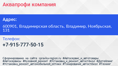 Аквапрофи, компания по адресу 600901, Владимирская область, Владимир, Ноябрьская, 131 в дальнейшем Организация, размещена в следующих категориях:
