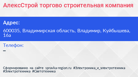 АлексСтрой, торгово-строительная компания по адресу 600035, Владимирская область, Владимир, Куйбышева, 16а в дальнейшем Организация, размещена в следующих категориях: