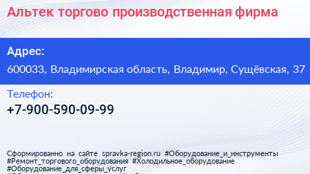 Альтек, торгово-производственная фирма по адресу 600033, Владимирская область, Владимир, Сущёвская, 37 в дальнейшем Организация, размещена в следующих категориях: