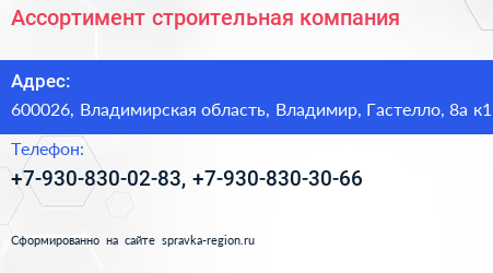 Ассортимент, строительная компания по адресу 600026, Владимирская область, Владимир, Гастелло, 8а к1 в дальнейшем Организация, размещена в следующих категориях: