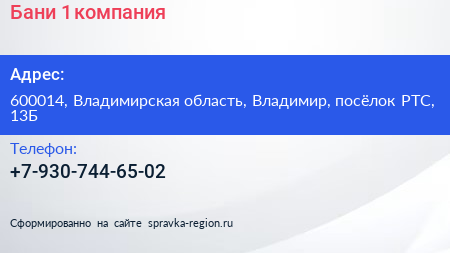 Бани №1, компания по адресу 600014, Владимирская область, Владимир, посёлок РТС, 13Б в дальнейшем Организация, размещена в следующих категориях: