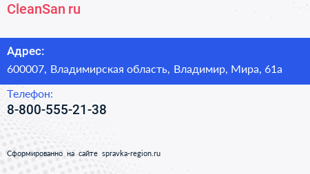 CleanSan.ru по адресу 600007, Владимирская область, Владимир, Мира, 61а в дальнейшем Организация, размещена в следующих категориях: