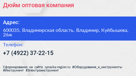 Дюйм, оптовая компания по адресу 600035, Владимирская область, Владимир, Куйбышева, 26ж в дальнейшем Организация, размещена в следующих категориях: