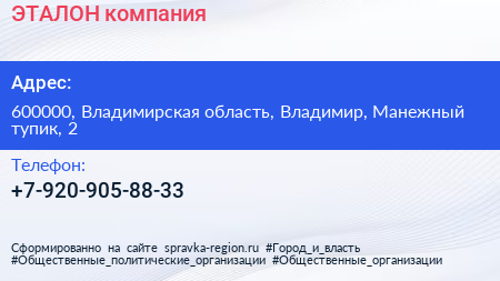 ЭТАЛОН, компания по адресу 600000, Владимирская область, Владимир, Манежный тупик, 2 в дальнейшем Организация, размещена в следующих категориях: