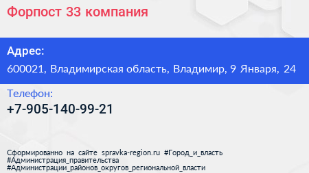 Форпост 33, компания по адресу 600021, Владимирская область, Владимир, 9 Января, 24 в дальнейшем Организация, размещена в следующих категориях: