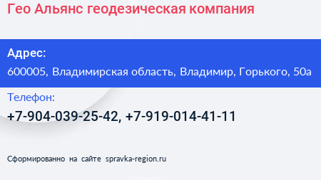 Гео-Альянс, геодезическая компания по адресу 600005, Владимирская область, Владимир, Горького, 50а в дальнейшем Организация, размещена в следующих категориях: