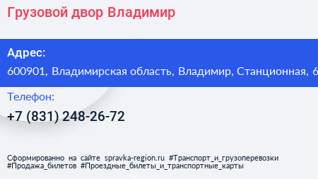 Грузовой двор Владимир по адресу 600901, Владимирская область, Владимир, Станционная, 6 в дальнейшем Организация, размещена в следующих категориях: