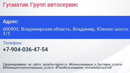 Гусматик Групп, автосервис по адресу 600901, Владимирская область, Владимир, Южное шоссе, 1/1 в дальнейшем Организация, размещена в следующих категориях: