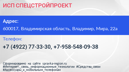 ИСП СПЕЦСТРОЙПРОЕКТ по адресу 600017, Владимирская область, Владимир, Мира, 22а в дальнейшем Организация, размещена в следующих категориях: