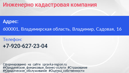 Инженерно-кадастровая компания по адресу 600001, Владимирская область, Владимир, Садовая, 16 в дальнейшем Организация, размещена в следующих категориях: