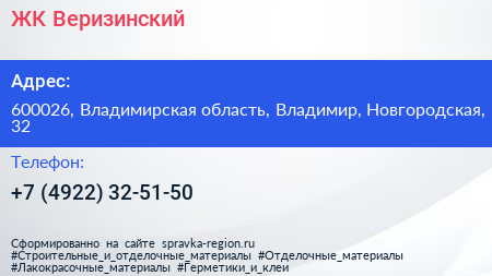 ЖК Веризинский по адресу 600026, Владимирская область, Владимир, Новгородская, 32 в дальнейшем Организация, размещена в следующих категориях: