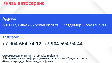 Князь, автосервис по адресу 600009, Владимирская область, Владимир, Суздальская, 4а в дальнейшем Организация, размещена в следующих категориях: