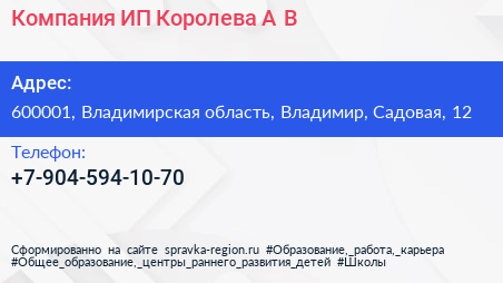 Компания, ИП Королева А.В. по адресу 600001, Владимирская область, Владимир, Садовая, 12 в дальнейшем Организация, размещена в следующих категориях: