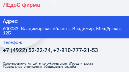 ЛЕдоС, фирма по адресу 600033, Владимирская область, Владимир, Мещёрская, 12Б в дальнейшем Организация, размещена в следующих категориях: